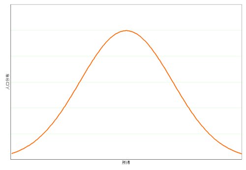 例えば、bewaadさんの着想にならって、ある社会における能力の分布は正規分布となっているとしましょう。このときに所得と人口の分布の関係を図にすると次のようになります。