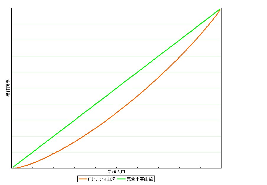 ここにオレンジで描かれた曲線はロレンツ曲線(Lorenz Curve)と呼ばれ、X軸は累積人口、Y軸は累積所得を表しています。より直観的にいえば、所得の低い人から順番に所得を積み重ねていったときに描かれる曲線ということになるでしょう。