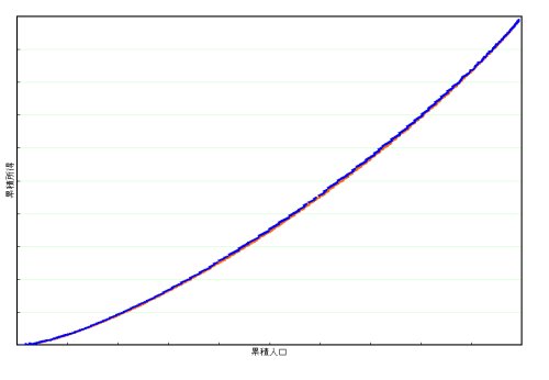 一見青い線しか見えませんが、実はこれは所得分布Aのロレンツ曲線(赤)と所得分布Bのロレンツ曲線(青)が完全に一致しているために重なってしまっているためです。つまり、所得分布Aと所得分布Bのジニ係数は全く同一であることを意味します。