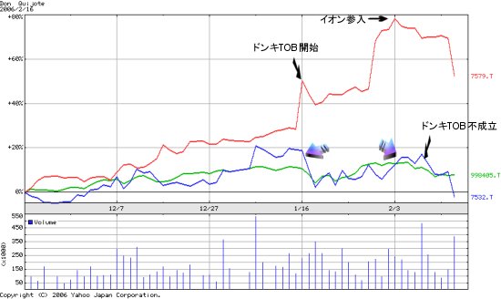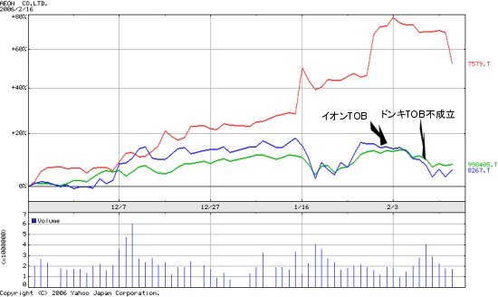 これが、「敵対的」であるということが分かって買収が完了する確率が低いと判断した結果なのか、それとも、単に市場がオーバーリアクションを見せただけなのかは、これだけでは分かりませんが・・・後者だとすれば、この辺りが日本の市場の効率性の一つの限界を示していることになりますね。 - イオンの参入でドンキの株価もあがっている